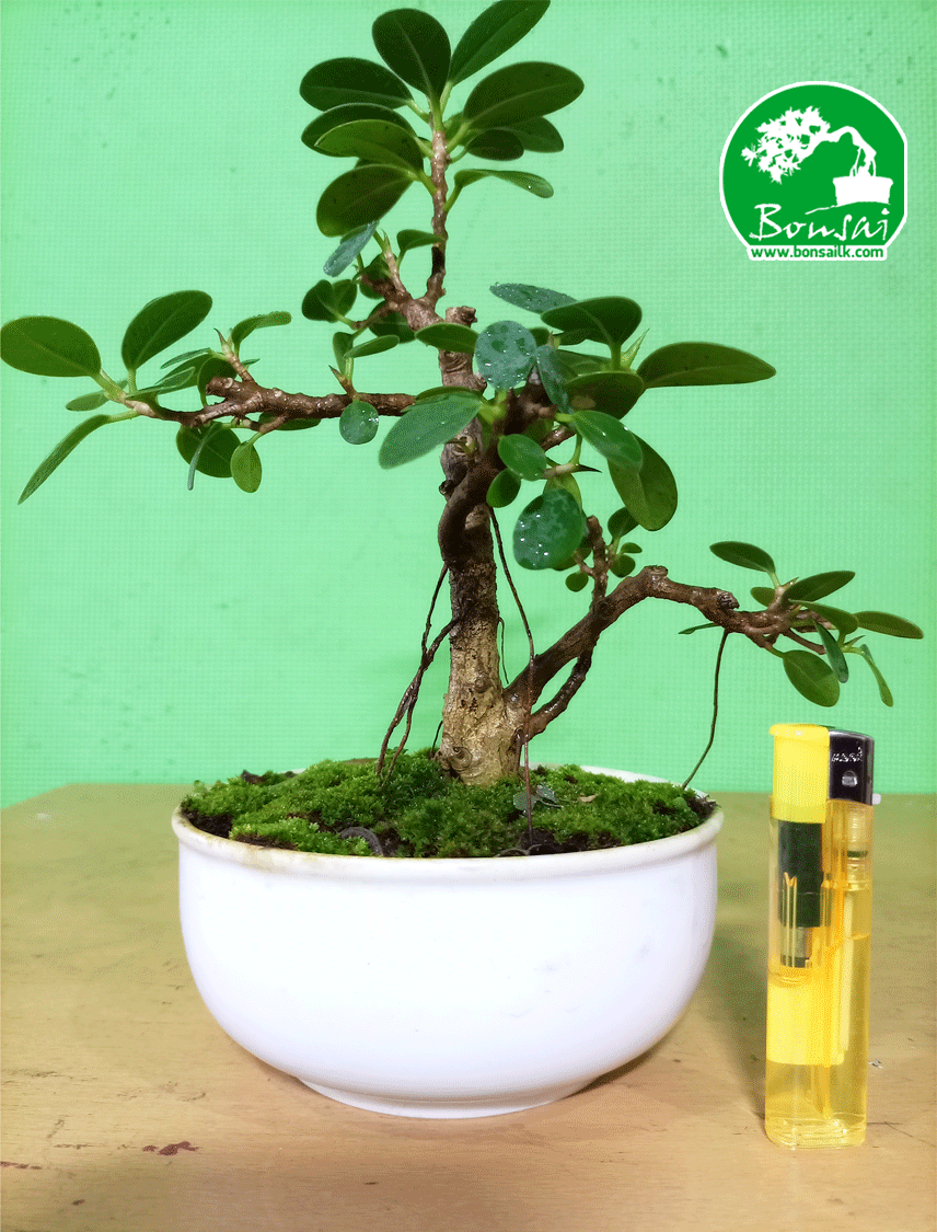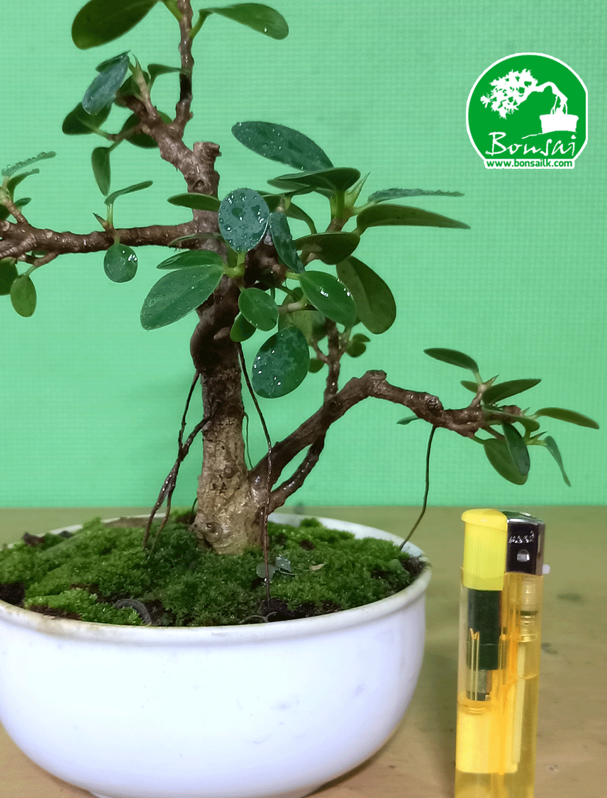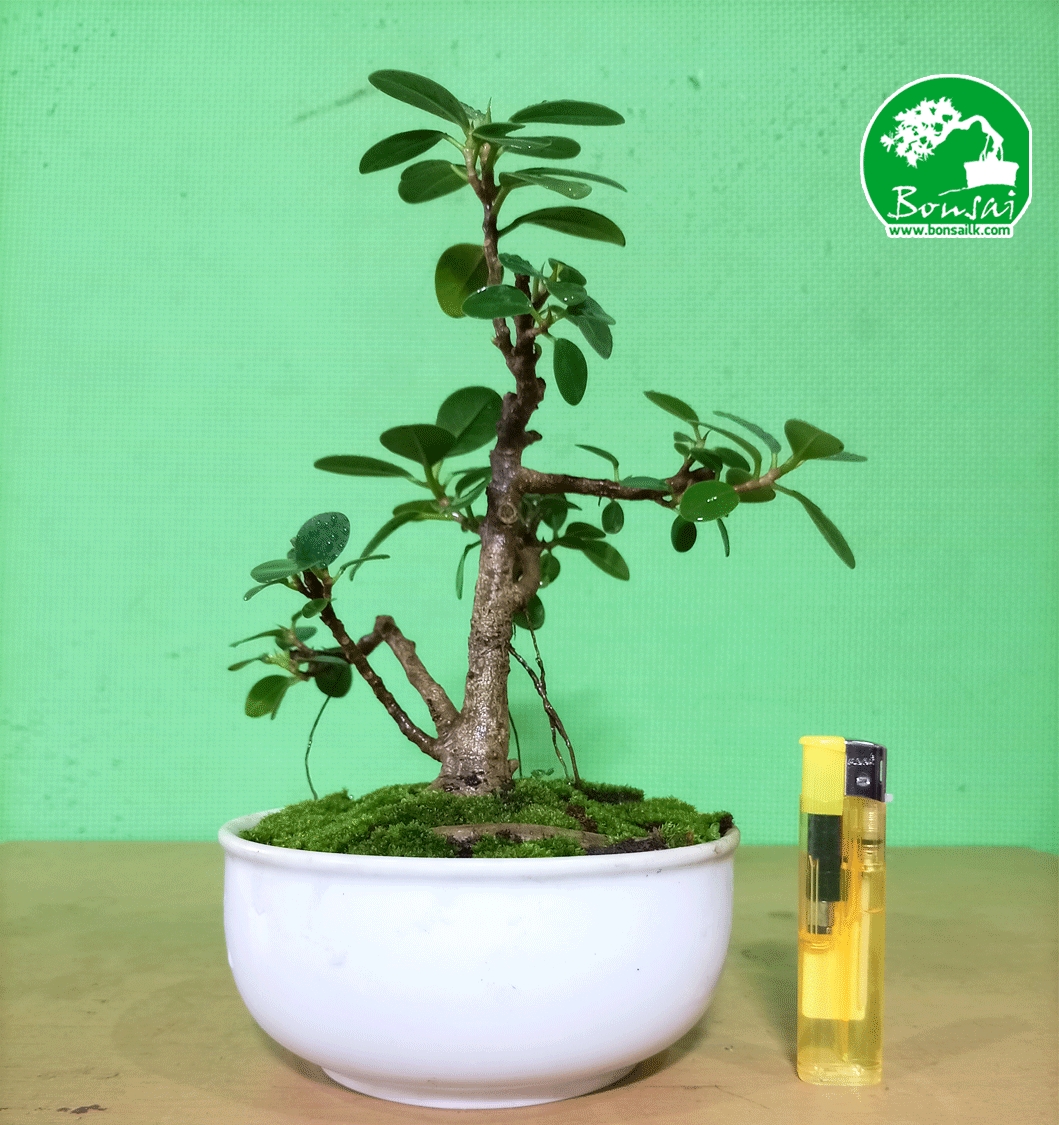 This beautifully styled Ficus bonsai is an excellent choice for beginners and collectors alike. Displayed in a round white ceramic pot, this small-sized bonsai features a strong central trunk with naturally spreading branches and small, rounded green leaves typical of the Ficus family.